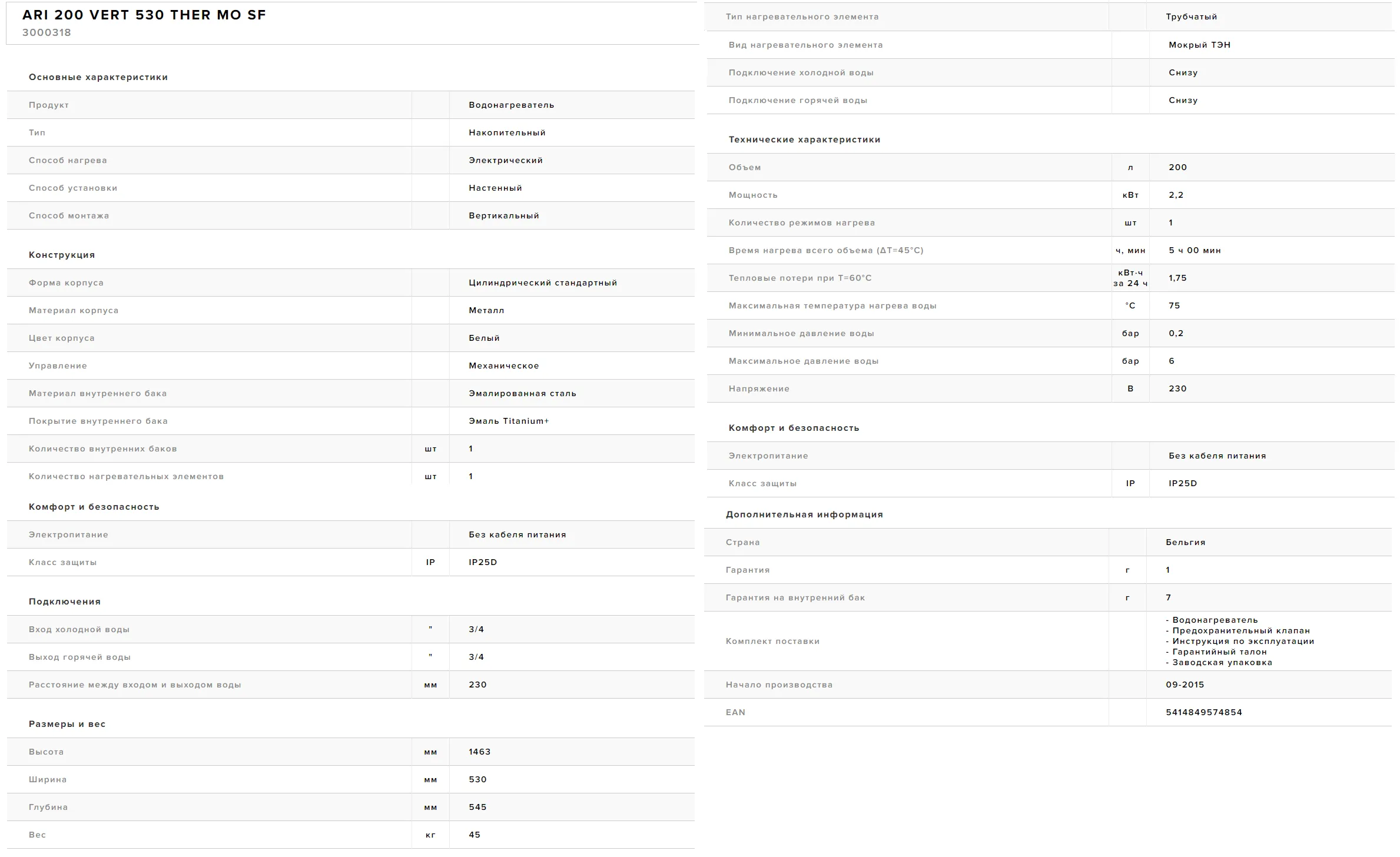 Круглые накопительные водонагреватели Ariston ARI VERT 530 THER MO SF с эмалированным внутренним баком имеют механическое управление на нижней части корпуса, которое сохраняет настройки нагрева при перепадах и отключениях электроэнергии. Для защиты водонагревателя от перегрева предусмотрены двойные термостаты, а также в комплекте есть предохранительный клапан, который помогает справиться с излишним давлением. Оптимальная мощность 2200 Вт адаптирует технику для работы в маломощных сетях.