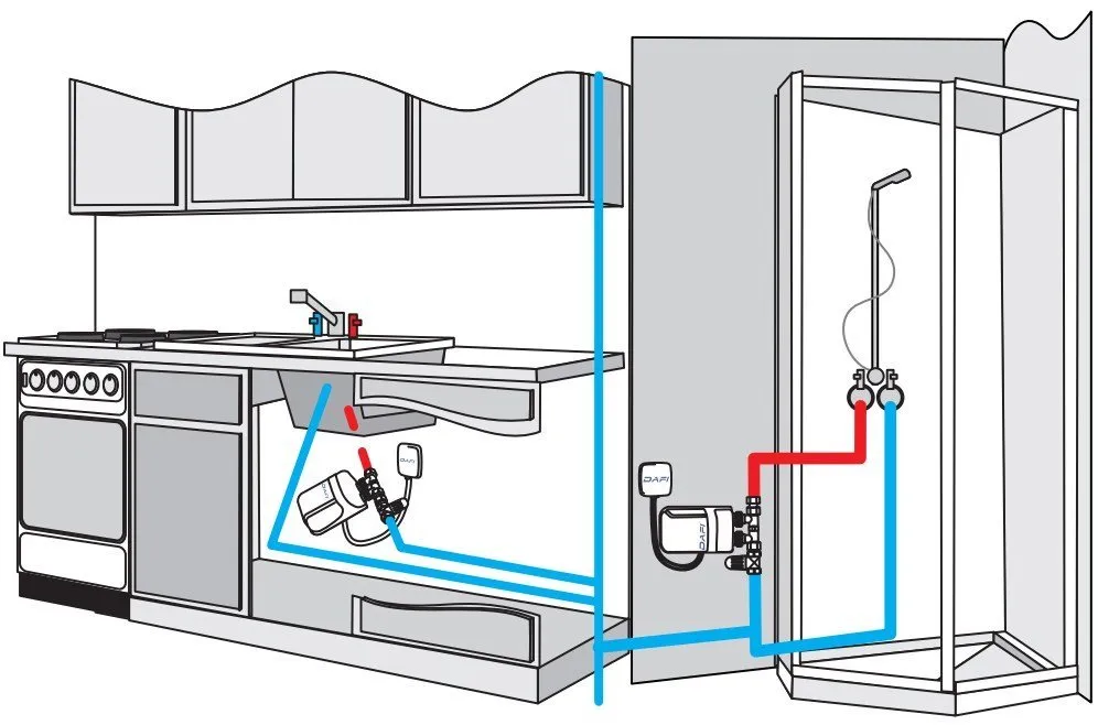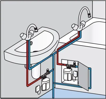 2. Для нескольких точек потребления горячей воды. Устанавливается на водопроводе (трубопроводе подачи холодной воды) как можно ближе к точке потребления горячей воды: смесителя или душа (под мойкой, в шкафчике, рядом с душевой кибиной)